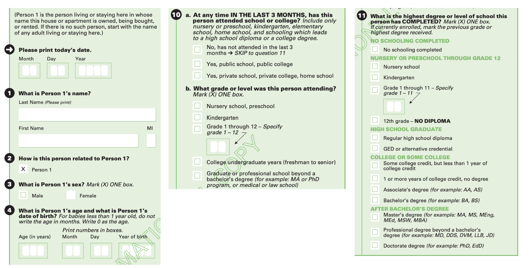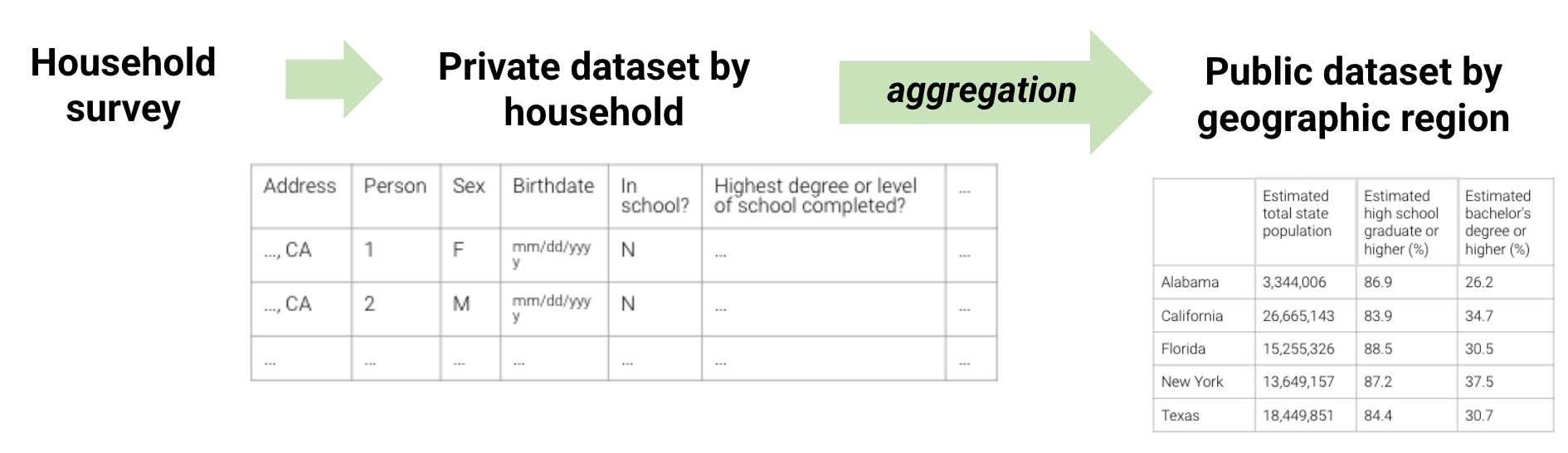 There are (at least) two datasets collected by the ACS: A private dataset of survey responses by household (Figure 1), and a public-facing dataset of responses by geographic region. The variables for the geographic region, a larger unit of analysis, are constructed via aggregation and estimation (Figure 2):