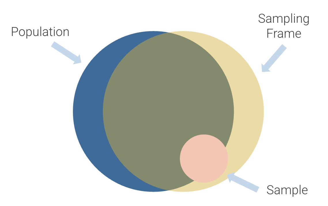The set of individuals we actually draw our sample from is the sampling frame. Depending on how we select our sample, we may miss individuals from the population we’re interested in, and we might also include individuals that are not in the population.