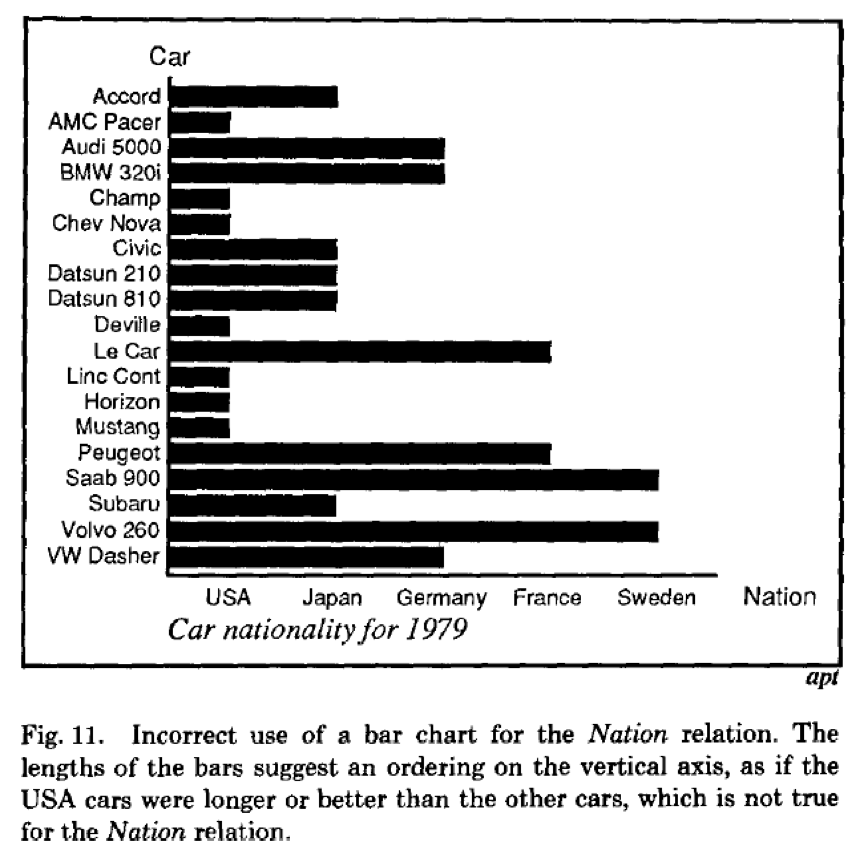 Problem: This graph implies that Swedish cars are “greater” than cars from other countries in some sense, when they’re not. If the variable is just “country of origin” (nominal categorical), using length encoding suggests an ordering that doesn’t exist.