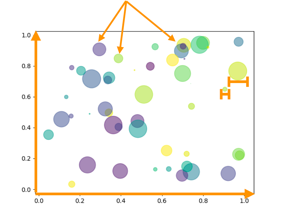 - Size of the dot: Variable 3 (represented by different bubble sizes). Note that this is area. More later…