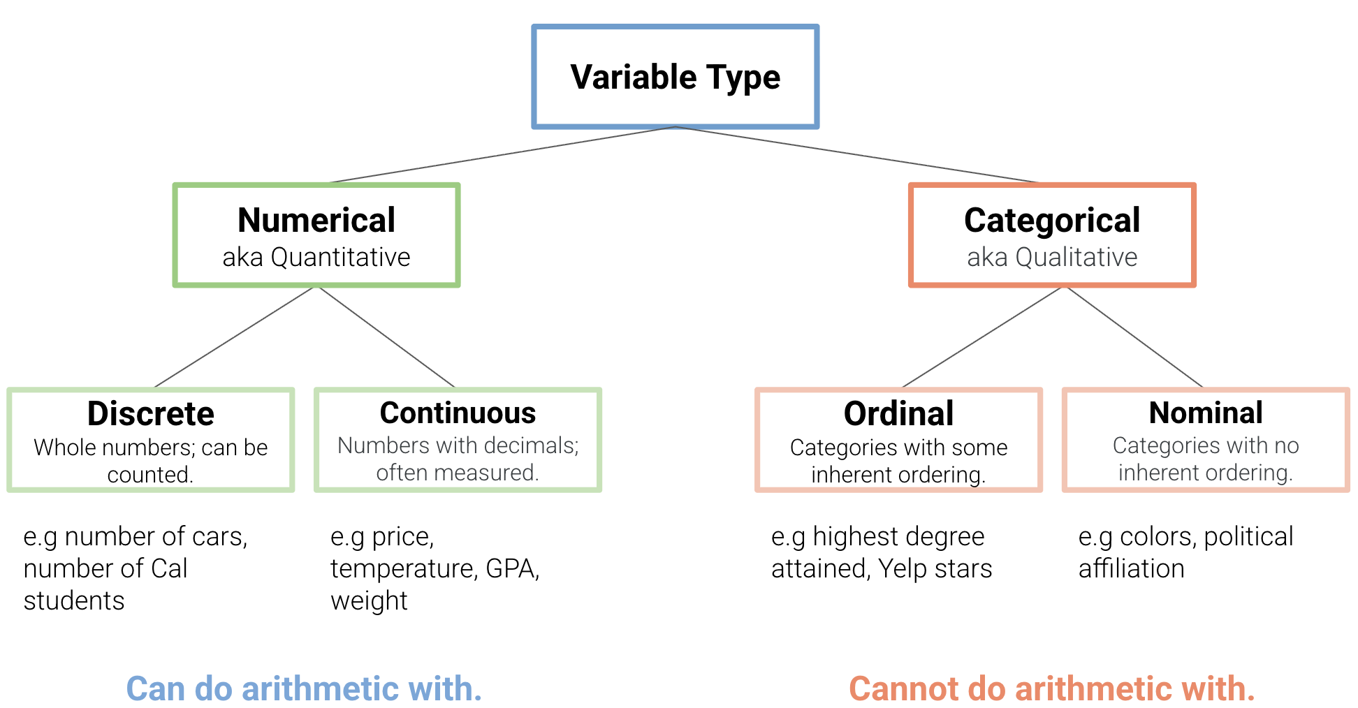 As we learned when studying variables, different variable types (numerical vs. categorical, discrete vs. continuous, ordinal vs. nominal) have different properties. When creating visualizations, we need to match our encoding choices to these variable types.