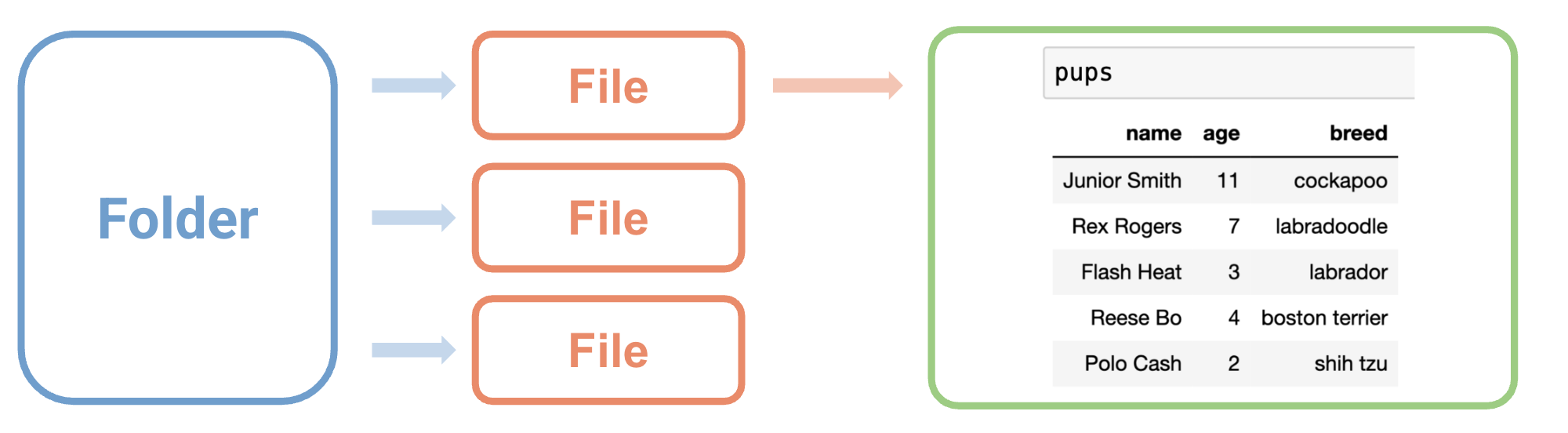 tbl = Table.read_table(file_path)In our example pups case, the pups.csv file is located in the data directory (say, on DataHub), so our argument to read_table is the string "data/pups.csv". The argument to file_path could also be a link to a CSV on the internet.