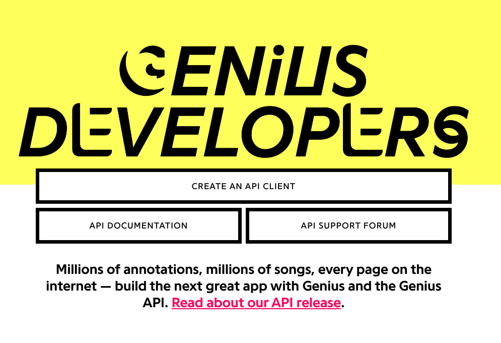 This tutorial walks you through obtaining an API Key for the Genius API. This tutorial is adapted from Intro to Cultural Analytics by Melanie Walsh.