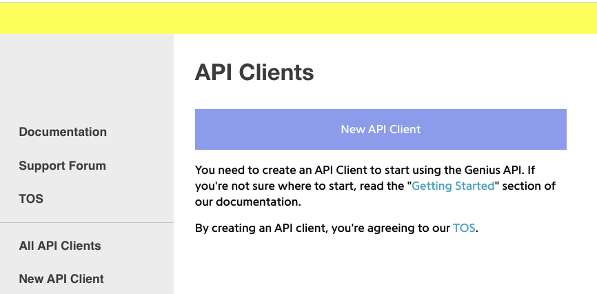 Once you’re signed in, you should be taken to https://genius.com/api-clients, where you need to click the button that says “New API Client.”