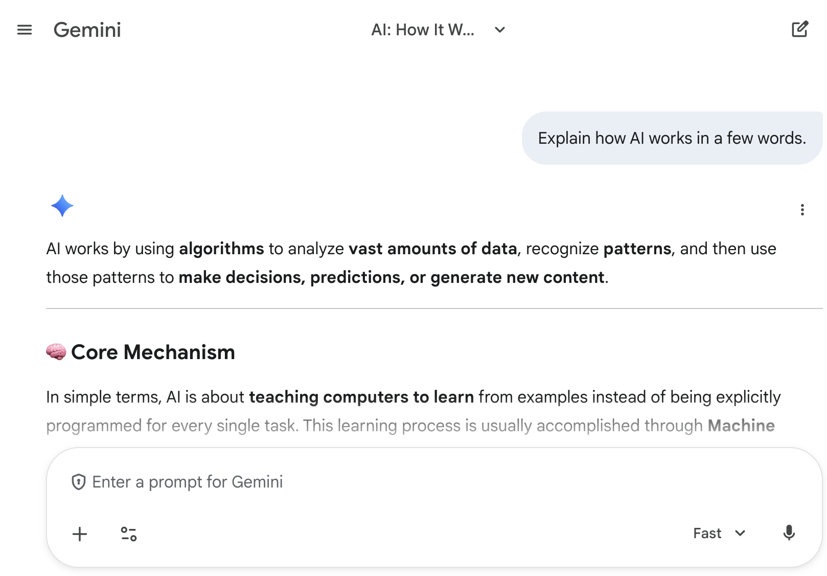- The user prompt: “Explain how AI works in a few words.”